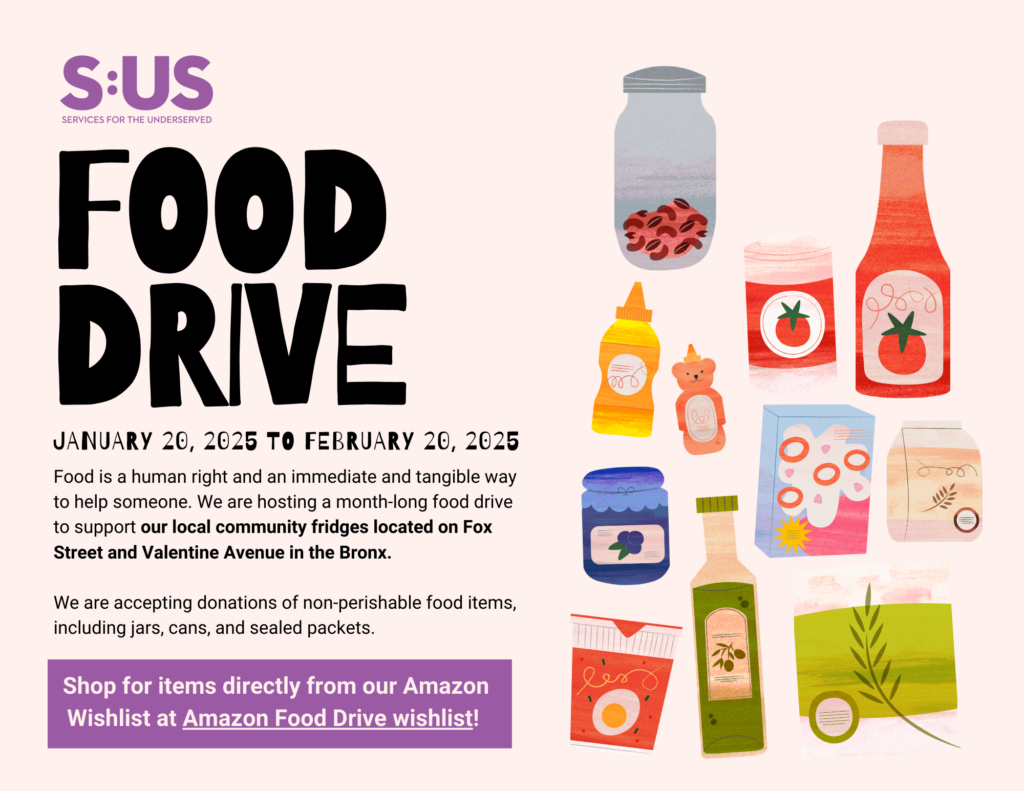 To help address this urgent need, we are hosting a month-long food drive to support our community fridges located in the Bronx at Fox Street and Valentine Avenue. We are accepting donations of non-perishable food items, including jars, cans, and sealed packets.
