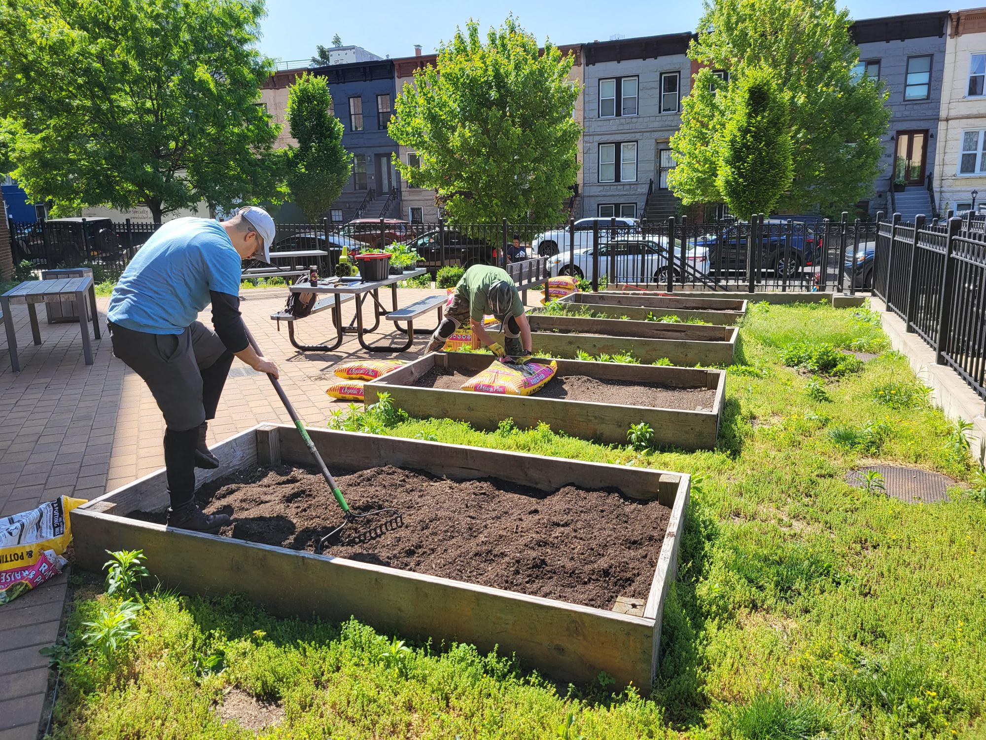 Photo: Urban farmer Rauly (in blue shirt) cultivates soil in raised beds at an S:US supportive housing.