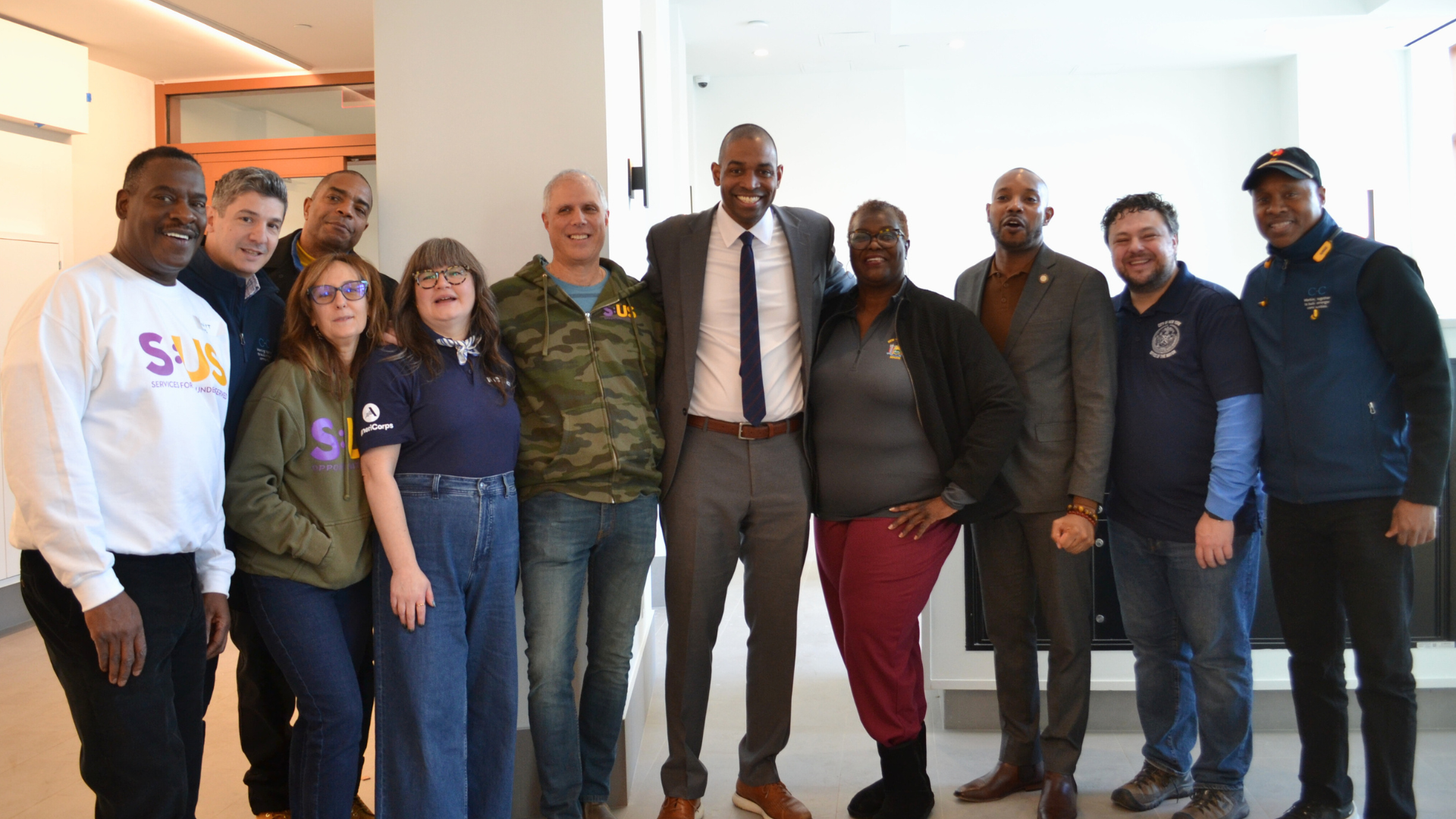 Staff from L+M Development Partners and C&C Apartment Management with Monica Santos, S:US Chief Program Officer, Perry Perlmutter, S:US President & CEO, Laura Rog, NYC Chief Service Officer, plus electeds NYS Lt. Gov. Antonio Delgado, State Senator Roxanne Persaud, and Council Member Chris Banks.