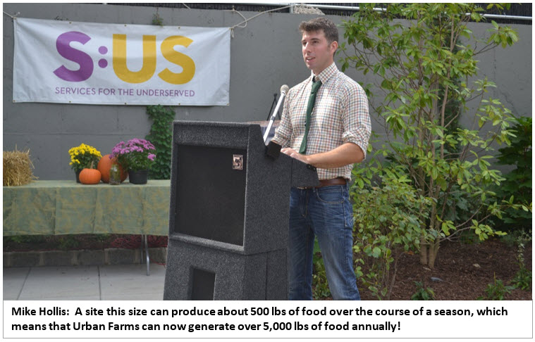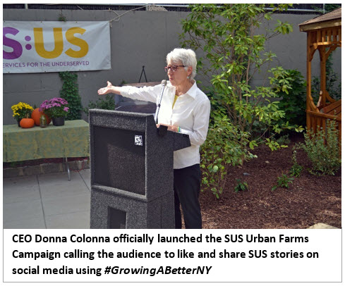 The first remarks were made by S:US CEO Donna Colonna (right). “Six years ago we had a vision, and it was pretty big… and that vision was not just about producing product but also supporting people toward a life. Our farms create opportunities for personal enjoyment, healthy eating and developing new skills, whether culinary arts or horticulture. It’s also about building community, employment and building hope and resiliency. It’s about recovery and potential. There’s so many ways that the farms connect to the work that we do…We had a great harvest this year, and we are rolling out our Urban Farms campaign Growing A Better New York with #GrowingABetterNY. Part of this campaign is getting volunteers to contribute (like the volunteers who helped with the installation of this farm); businesses to hire people who have gone through training both for horticulture and for culinary arts; and donating – to support the continuation of both the horticulture coaches and building of the farms…You can also promote the S:US urban farming and horticulture by dedicating a stake in your garden towards S:US.”