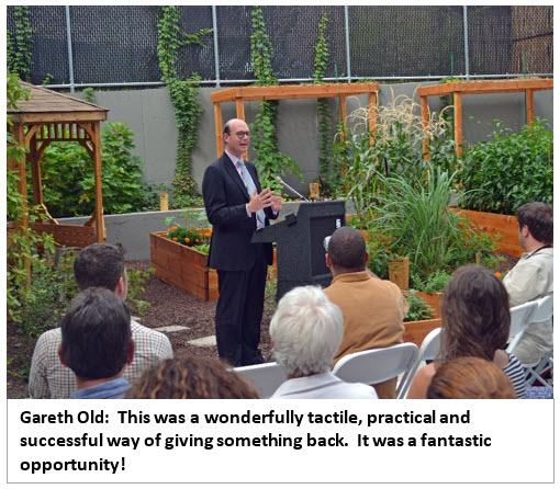 Gareth Old, (right, below) a partner in the law firm Clifford Chance, spoke next. Besides being the Chairperson for the S:US Board, Gareth also led a group of volunteers from Clifford Chance in kicking off the creation of the Third Ave urban farm earlier this year. Clifford Chance then adopted the Third Avenue community farm, giving S:US the resources needed to transform it into a fully-operational urban farm. S:US is grateful to Gareth and Clifford Chance for helping to grow a better New York.