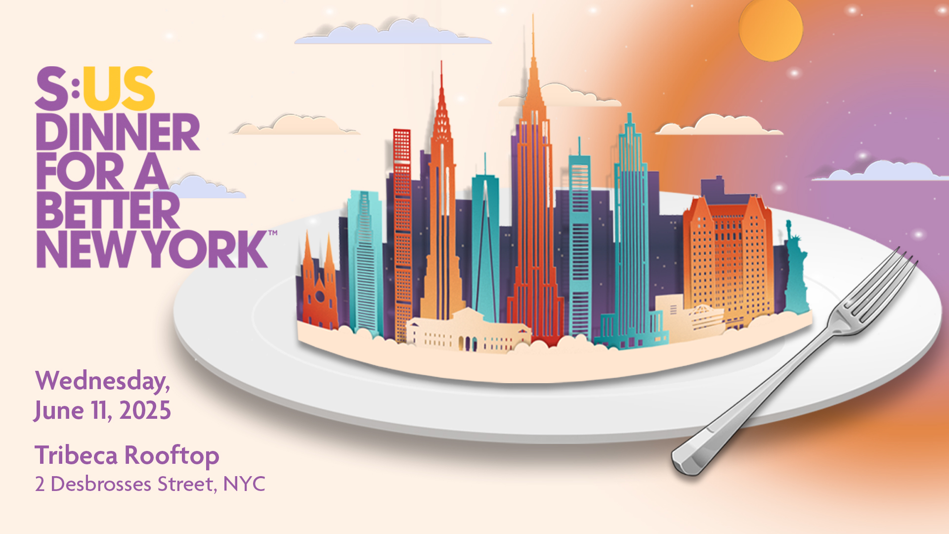 We invite you to this year’s Dinner for a Better New York on Wednesday, June 11, 2025, at Tribeca Rooftop. Curated by Chef Andrew Zimmern, this unforgettable evening supports S:US’ mission to eradicate homelessness and provide opportunity for all.