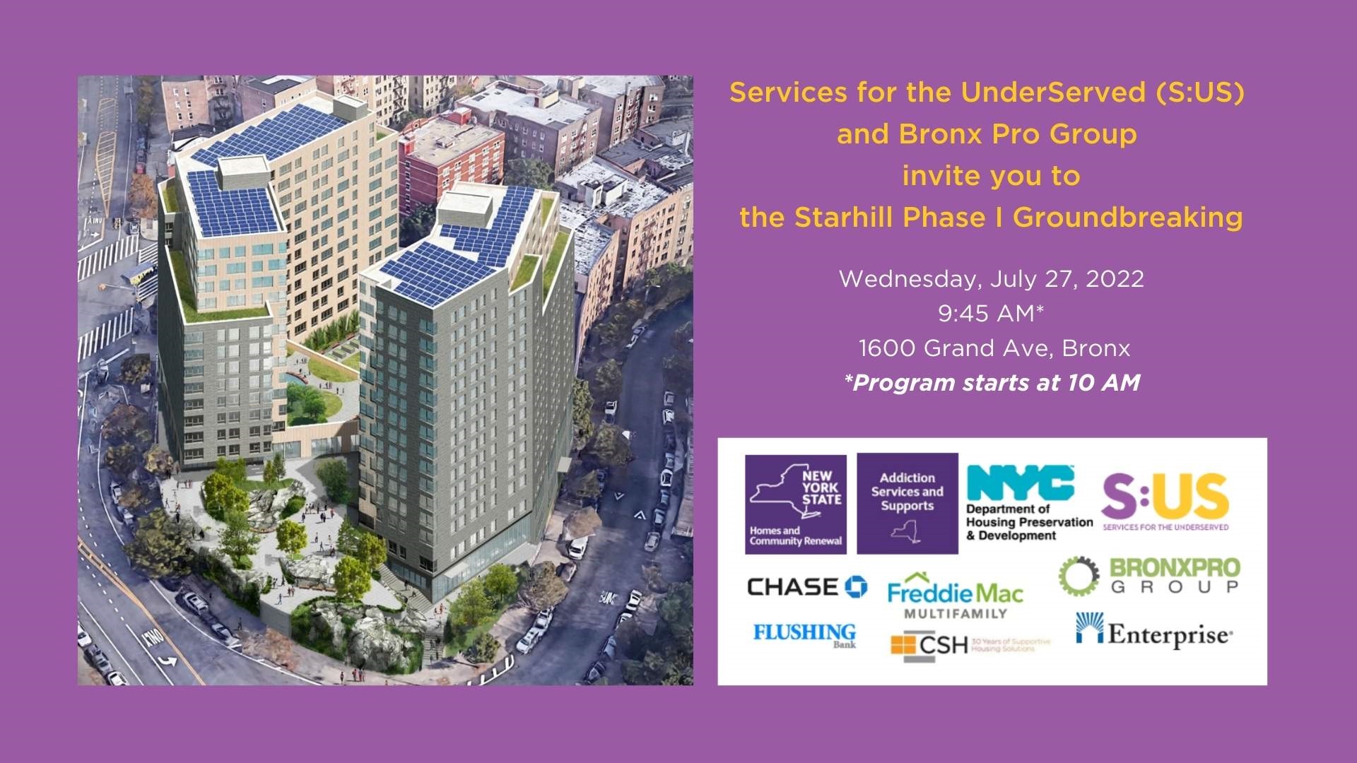 S:US creates life-changing opportunities that generate permanent, positive impact in the lives of thousands of our city’s most underserved individuals and families. With residential and support services in 42 of our city’s 59 community boards, S:US provides solutions that contribute to righting societal injustices. In partnership with Bronx Pro Group, a neighborhood-based developer, S:US looks forward to celebrating the groundbreaking of Starhill with you!