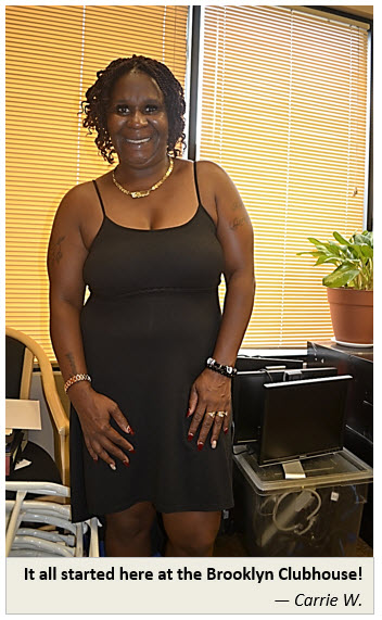 We weren’t originally scheduled to interview her, but Carrie W. was beaming from ear to ear and could not wait to share her story. She has been a Brooklyn Clubhouse member since 2011. A year later she attended S:US’ Peer Education class and after graduating, we hired her as a Peer Specialist. This was the first stepping stone for Carrie to obtain a job with another nonprofit as a client advocate.