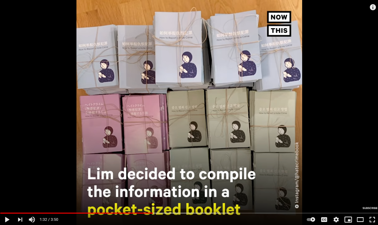 In honor of Asian Pacific American Heritage Month, we would like to share a resource spearheaded by Esther Lim. She created a booklet in Chinese, Korean, Japanese, Thai, Vietnamese, Tagalog and Spanish, to help provide a sense of empowerment and encourage victims to seek help. “English isn’t my first language,” one of the phrases says. “Someone is following me. Can you stay next to me until it is safe?” She plans to add Khmer, Arabic, Indonesian and Farsi.