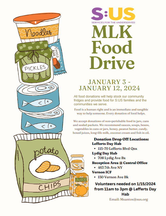 We are hosting a food drive to support our community. We are accepting donations of non-perishable food in jars, cans and sealed packets. We recommend sauces, soups, beans, vegetables in cans or jars, honey, peanut butter, candy, boxed juices, long-life milk, coconut cream, and fish in oil. All food donations will help stock our community fridges and provide food for S:US families and the communities we serve.