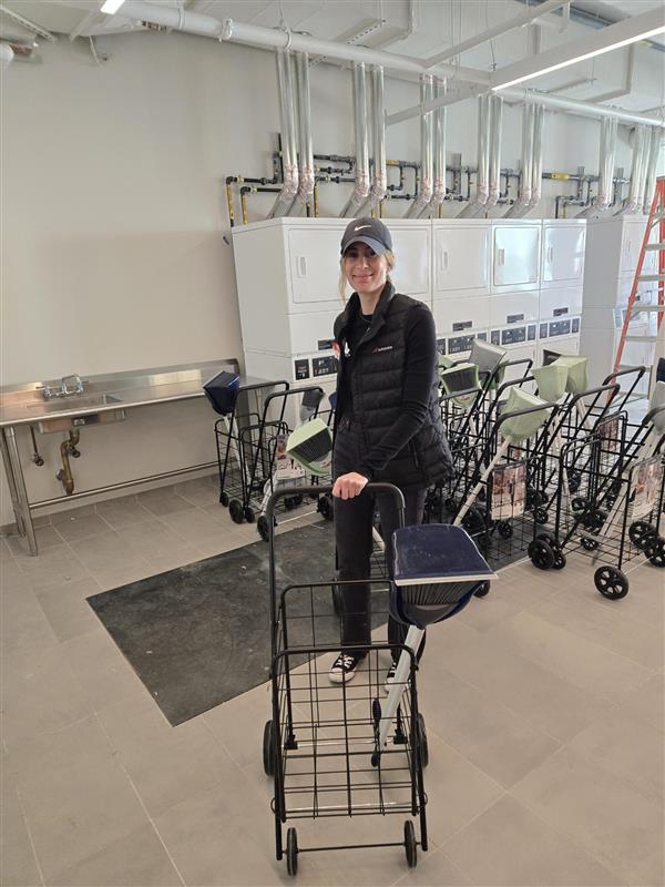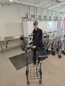 Catherine moving shopping carts to create starter kits at Starhill, supportive housing in the Bronx, in April 2025.