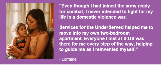 S:US works to improve the lives of people with disabilities, people living in poverty, and people experiencing homelessness, and the women we serve often face unique challenges. For example, women and children who are homeless after fleeing domestic violence also must deal with trauma as they search for a new home. Below is a quote from Lorraine (name and likeness have been changed for privacy), a veteran and survivor of domestic violence who has benefited from our programs.